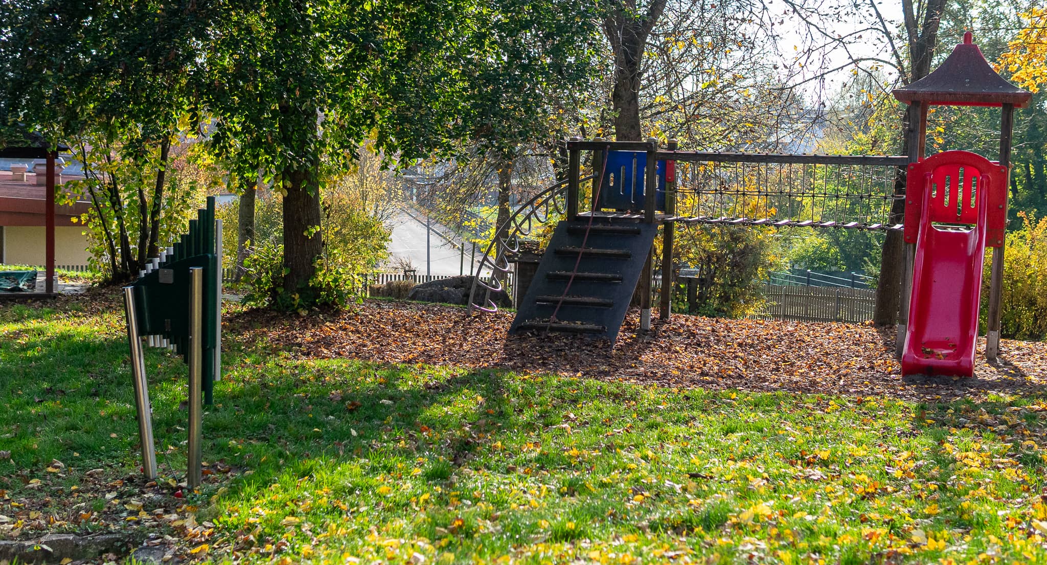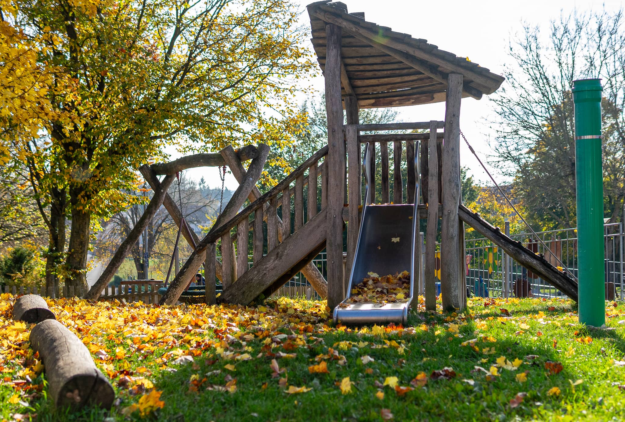 Das Klettergerüst mit der Rutsche, ein Wippfahrzeug sowie zwei Schaukeln, lassen so manchen Bewegungsdrang ausleben. Das Kinderhaus hat die Möglichkeit den angrenzenden Sportplatz für größere Aktionen mitzubenützen.